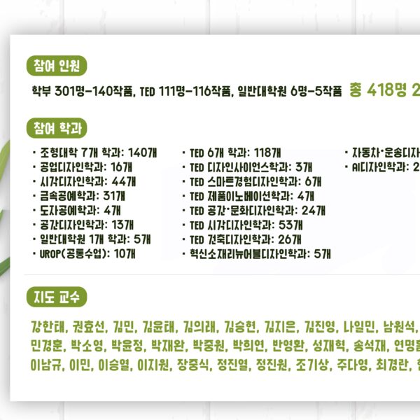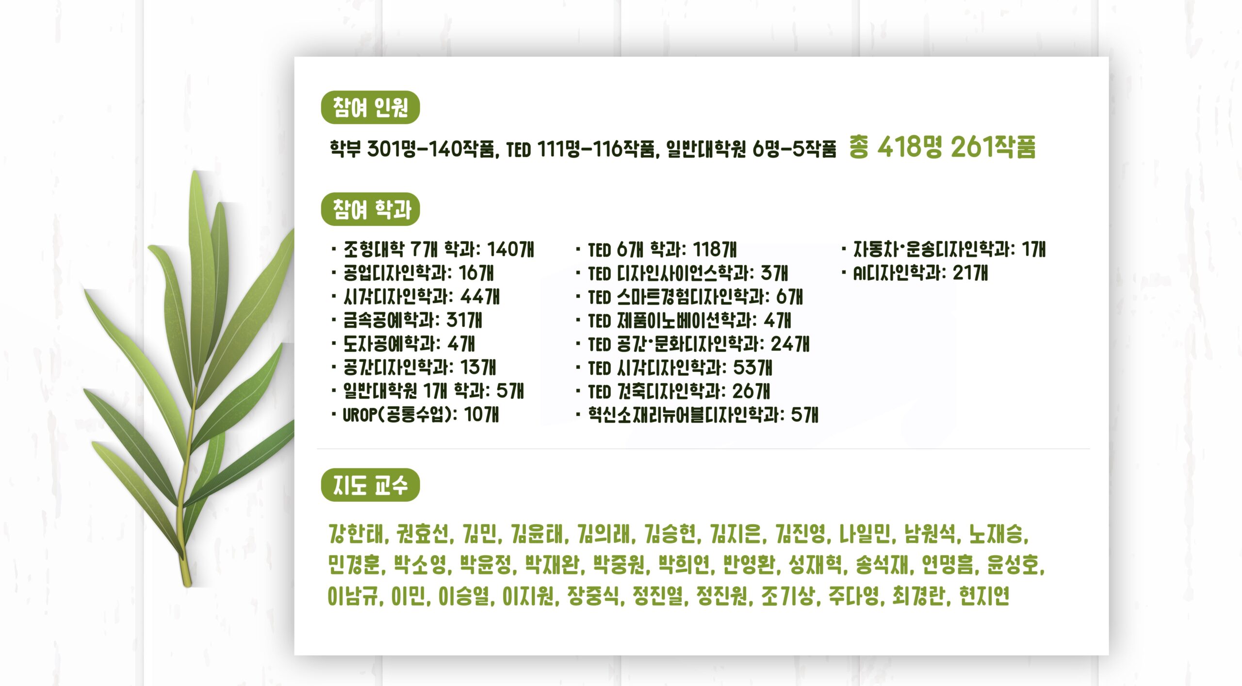 2023년 봄학기 수업을 통해 국민대학교 조형대학 7개 학과(공업디자인, 시각디자인, 금속공예, 도자공예, 공간디자인, 자동차운송디자인, AI디자인)의 학부생과 테크노디자인전문대학원(TED) 6개 학과(디자인사이언스, 스마트경험디자인, 제품이노베이션디자인, 공간문화디자인, 시각디자인, 건축디자인) 및 일반대학원 1개 학과(혁신소재리뉴어블디자인학과 혁신제품디자인전공) 석/박사과정생 등 418명이 각 전공별 지도교수 33명과 함께 총 261점의 작품을 제작했다.