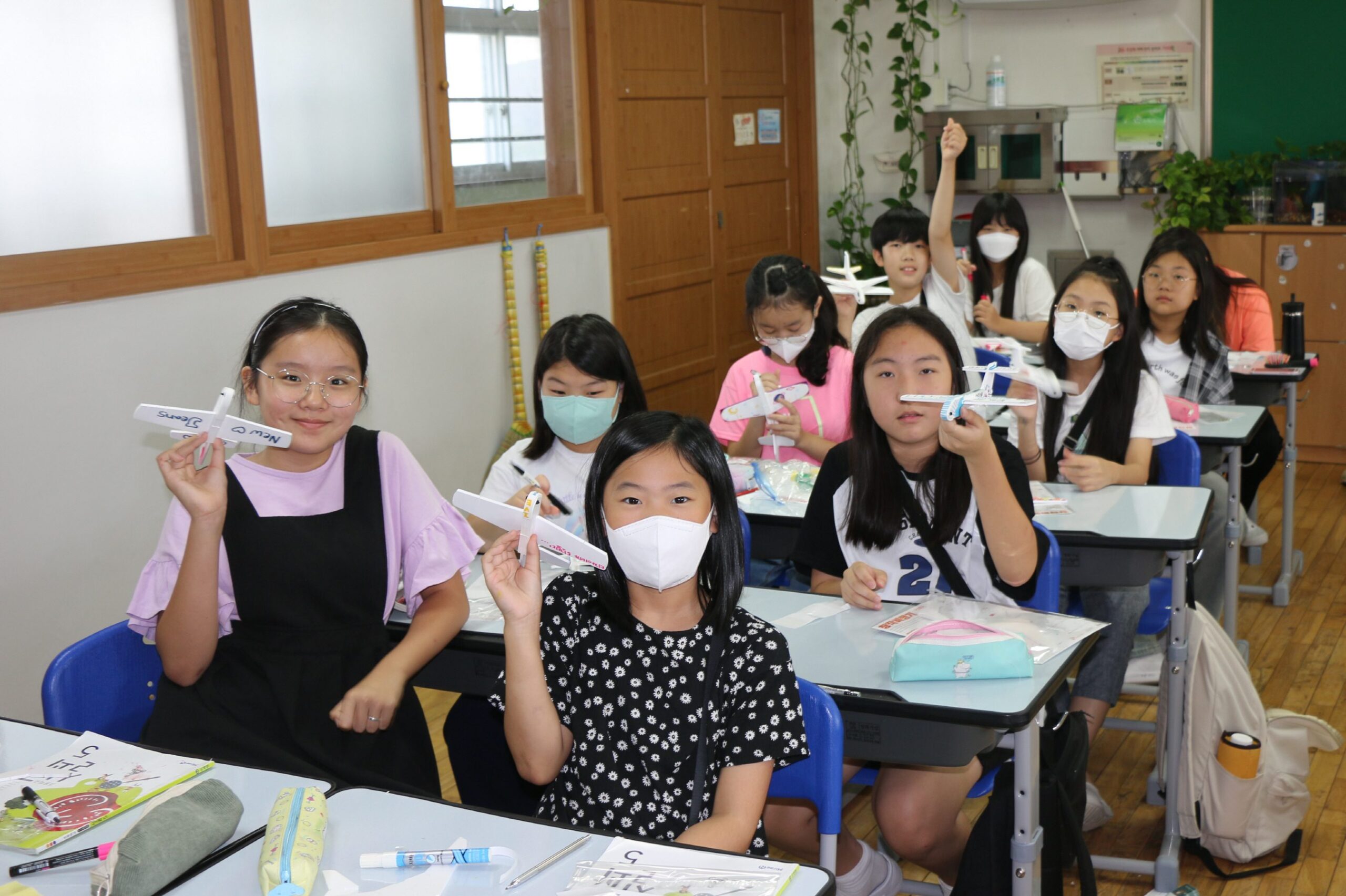 (사진1, 2, 3) SK인천석유화학 친환경 놀이과학교실에 참여한 인천 서구 해원초등학교 5학년 학생들이 지난 25일 1회차 수업으로 조립 비행기를 만들었다.