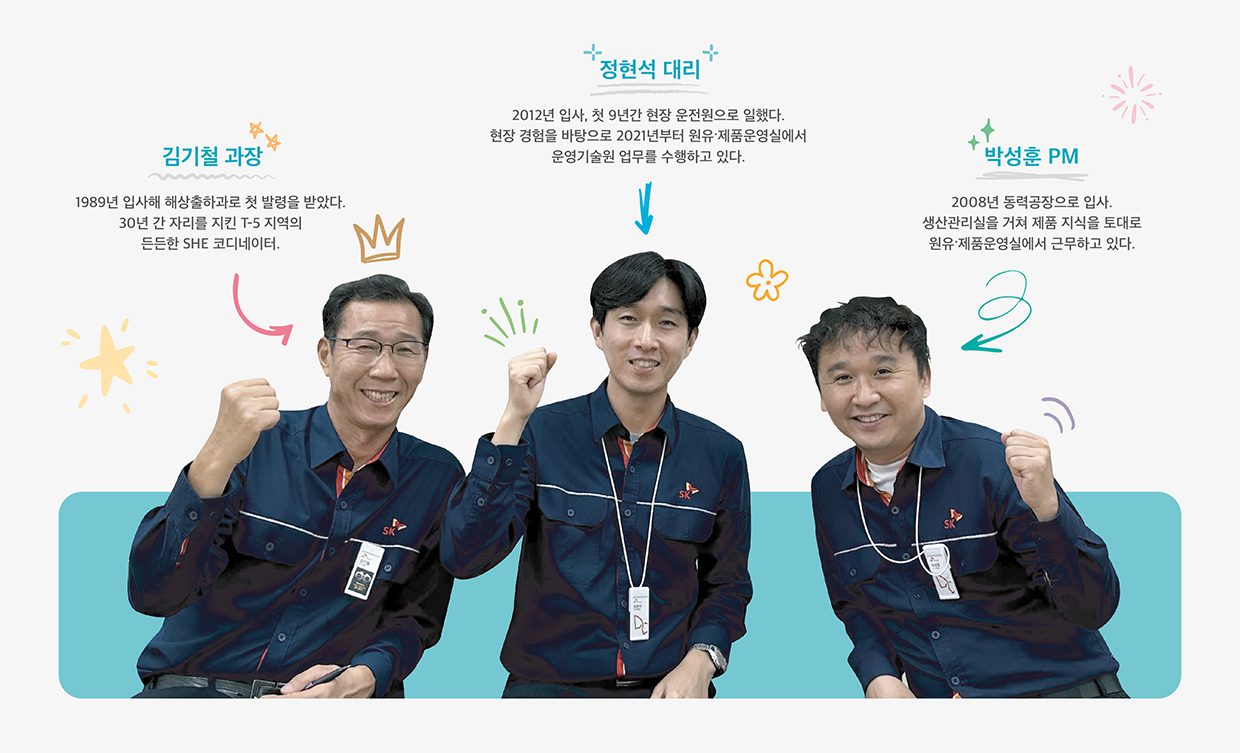 대한민국의 역동적인 산업 성장과 함께해 온 울산CLX. 그 중에서도 핵심 역할을 담당하는 T-5 지역 스팀(Steam) 사용량 절감을 위해 SK에너지 원유∙제품운영실 박성훈 PM, 정현석 대리, 석유출하2 Unit 김기철 과장이 일궈낸 일하는 방식의 혁신(일방혁)을 들여다보자.