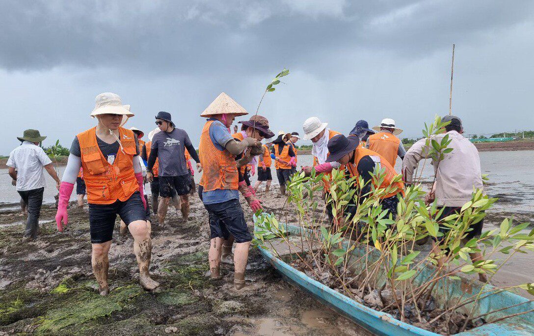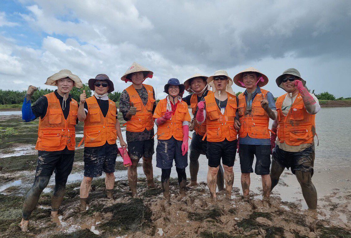 8월 29일(현지 시간), 베트남 짜빈성 즈웬하이현 지역 일대에서 맹그로브 식수 봉사활동을 마친 후 포즈를 취하고 있는 우정환 PM(오른쪽 첫번째)