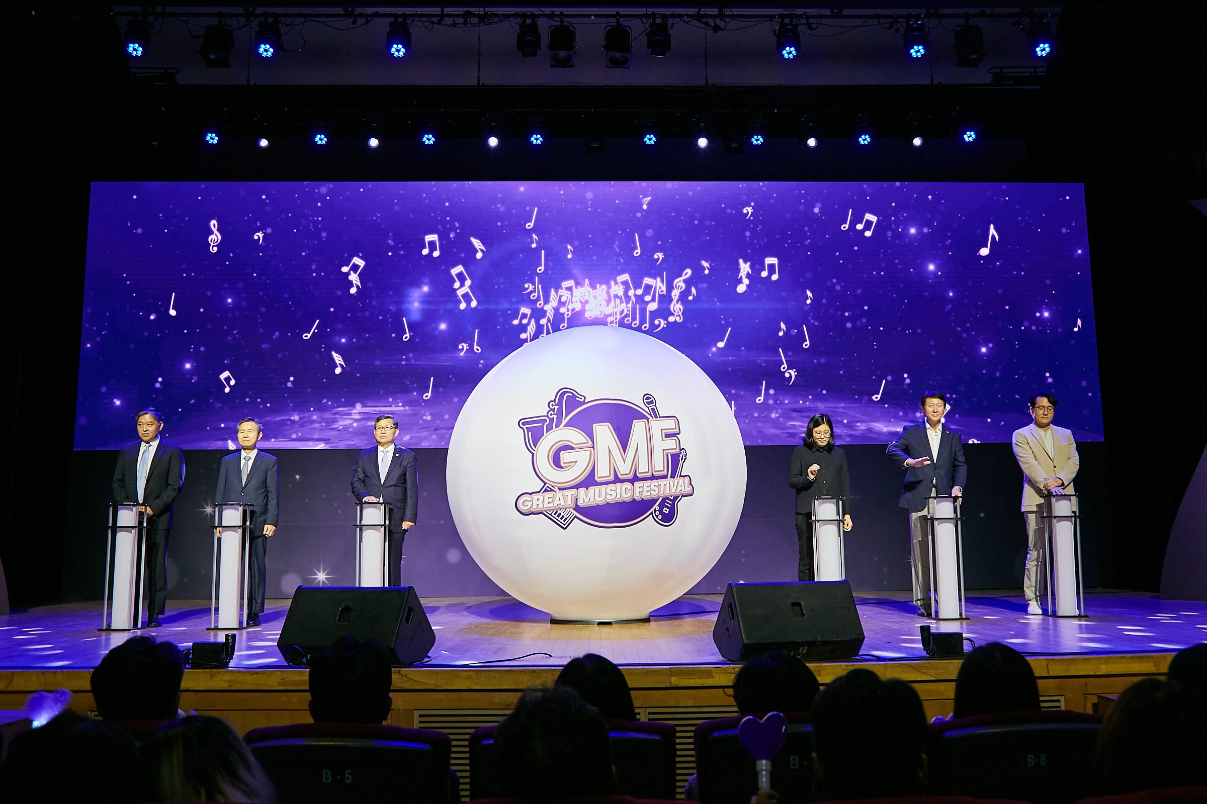 관객들이 미리 지급된 보라색 하트모양 응원봉을 객석에서 힘껏 흔들자, 무대 위 LED 화면에서는 커다란 음표 물결이 생겨났다. 뒤이어 문화체육관광부 전병극 제1차관을 비롯한 행사 관계자들이 무대 위에 세워진 기둥의 버튼을 누르자, 음표 물결이 중앙의 구체형 라이팅(Lighting) 풍선에 합쳐지며 밝은 빛을 내면서 공연장을 밝혔다. 이에 관객들도 뜨거운 박수와 함성을 보내며 GMF의 본격적인 시작을 알렸다.