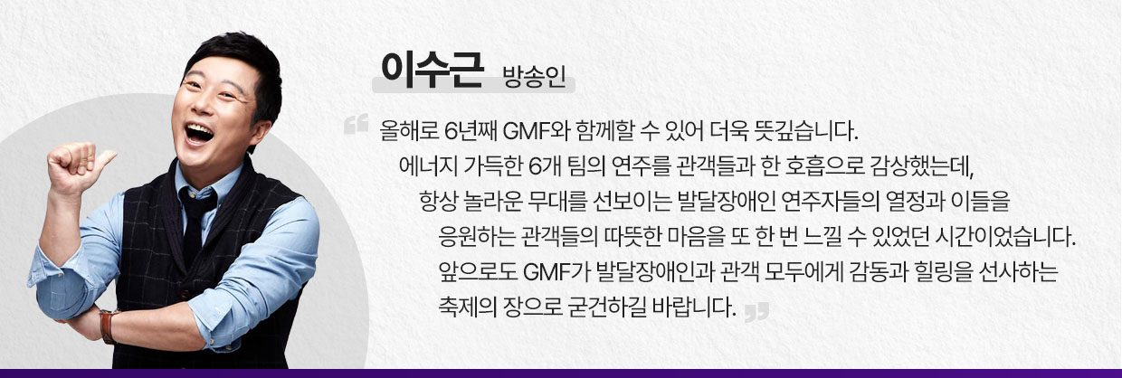제7회 GMF는 지난 2회부터 6년째 사회를 맡으며, 발달장애인의 꿈을 함께 응원해 온 방송인 이수근의 인사로 그 시작을 알렸다. 이날 SK이노베이션 계열 구성원들을 비롯해 공연장을 가득 채운 8백여 명의 관객들은 큰 환호로 화답하며, 발달장애인들의 반짝이는 재능이 더욱 빛날 수 있도록 마음을 보탰다.