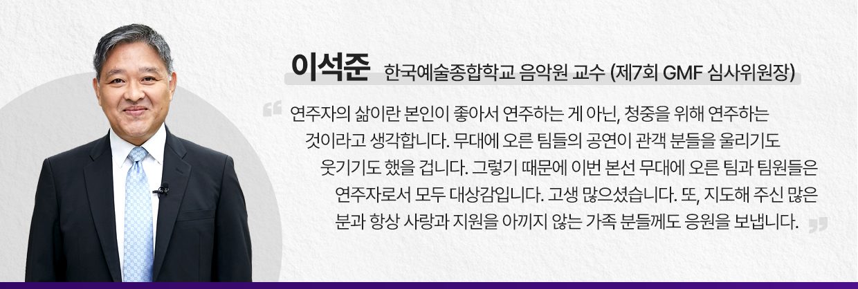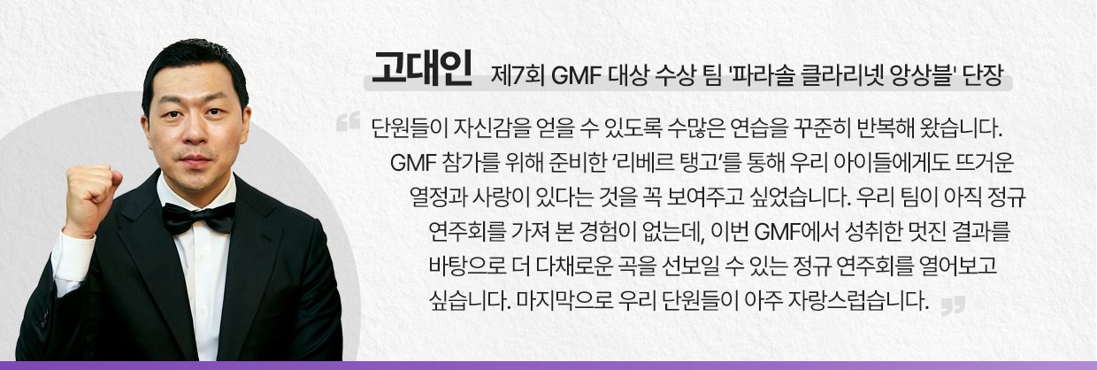 본선 무대의 여운이 채 가시기도 전에 지난해 열린 제6회 GMF에서 대상을 수상한 ‘아인스바움 윈드 챔버’가 준비한 특별 공연이 이어졌다. 발달장애인과 비장애인, 지휘자 등 경계 없는 단원들로 구성된 ‘아인스바움 윈드 챔버’는 우승의 영광을 안은 팀답게 윌리엄 하임스의 ‘Three Kings Swing’과 라파엘 에르난데스의 ‘엘 쿰반체로(El Cumbanchero)’를 연주해 1년 새 멋지게 성장한 모습을 또 한 번 보여줬다.