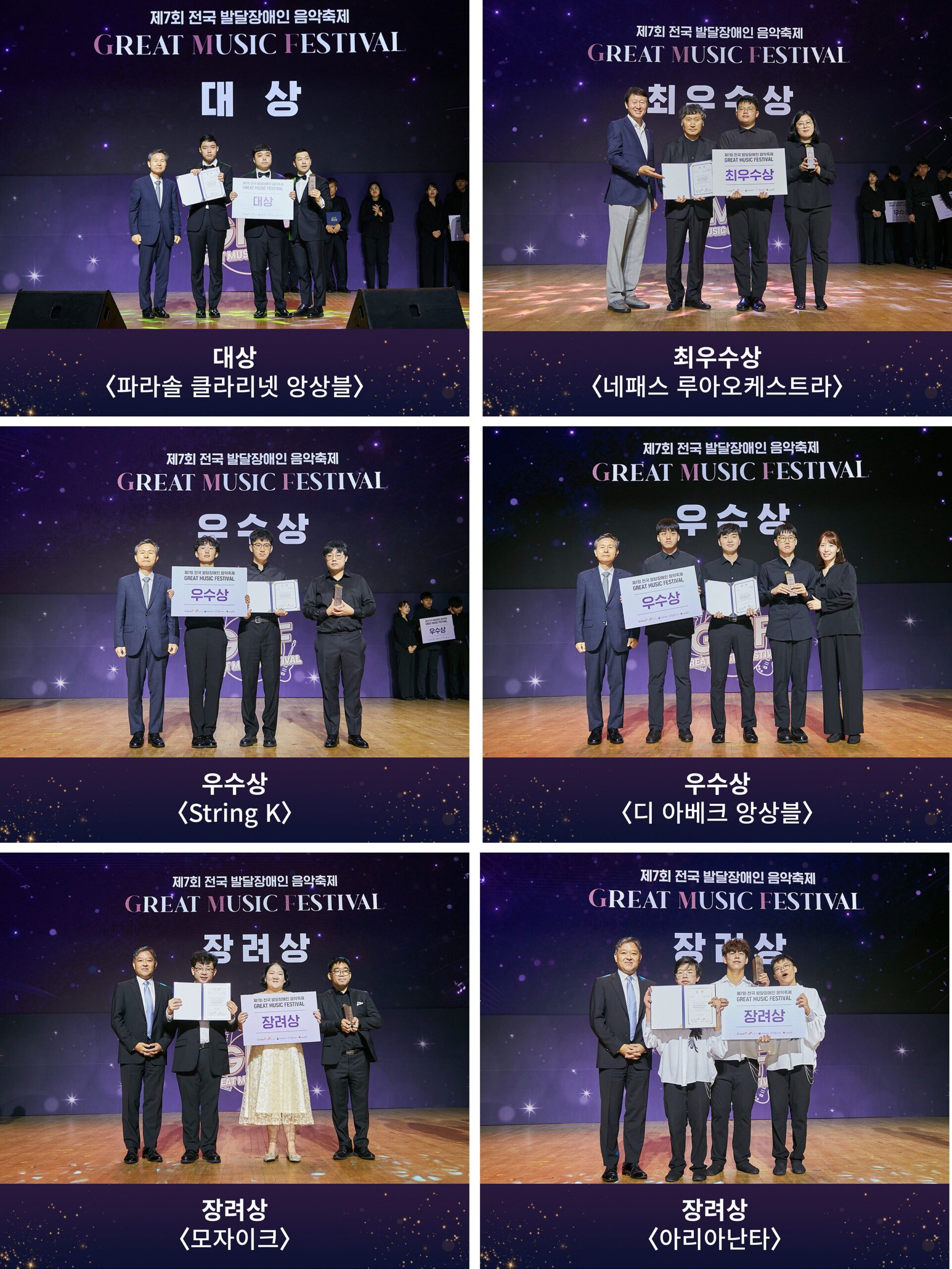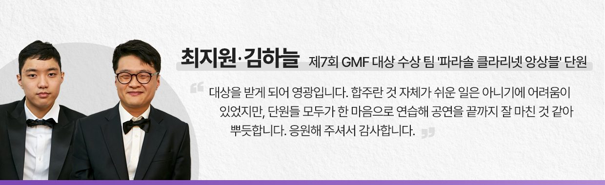 ‘아인스바움 윈드 챔버’의 축하 공연이 끝나자, 드디어 제7회 GMF의 심사 결과가 발표됐다. 대상 수상의 영예는 ‘파라솔 클라리넷 앙상블’에게 돌아갔다. 최우수상은 ‘네패스 루아오케스트라’가 수상했으며 우수상은 ‘String K’와 ‘디 아베크 앙상블’, 장려상은 ‘모자이크’와 ‘아리아난타’가 받았다.