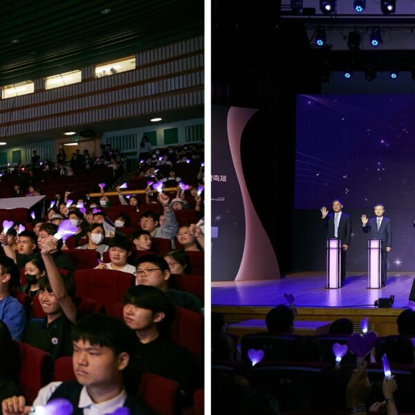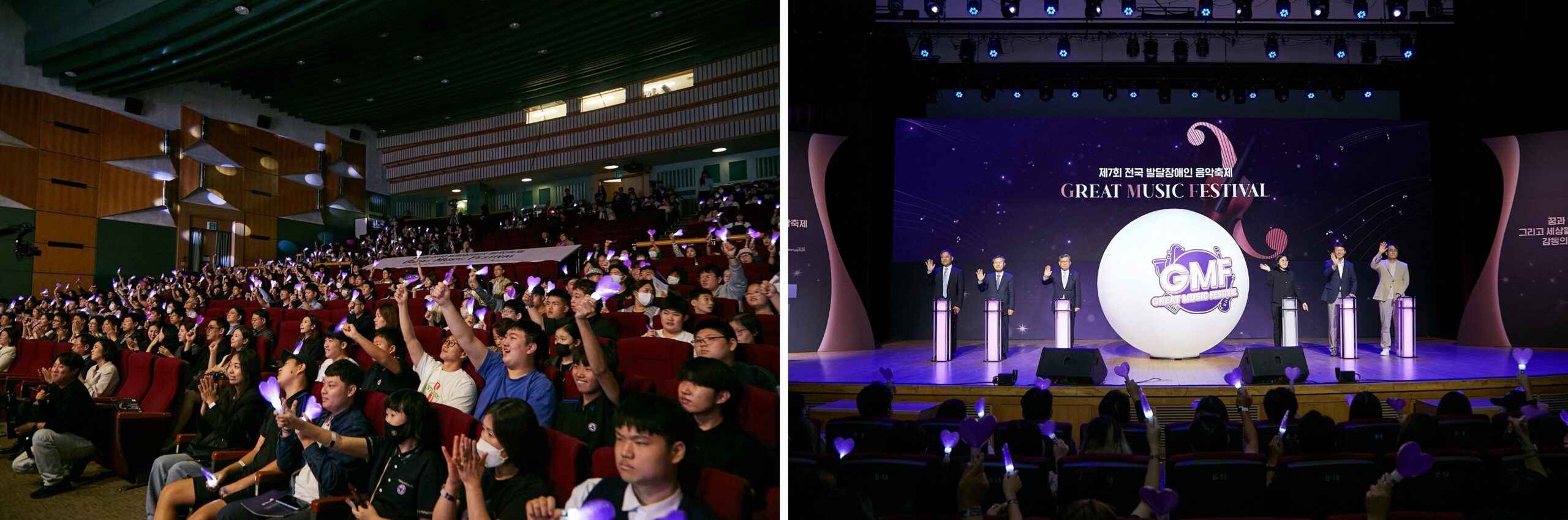 (좌) 제7회 GMF 관객들이 객석에서 하트 모양 응원봉을 흔들며 보라색 물결을 만들고 있다. / (우) 행사 관계자들이 무대에 올라 오프닝 세리머니를 하고 있다.