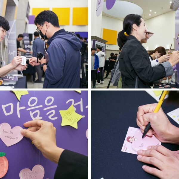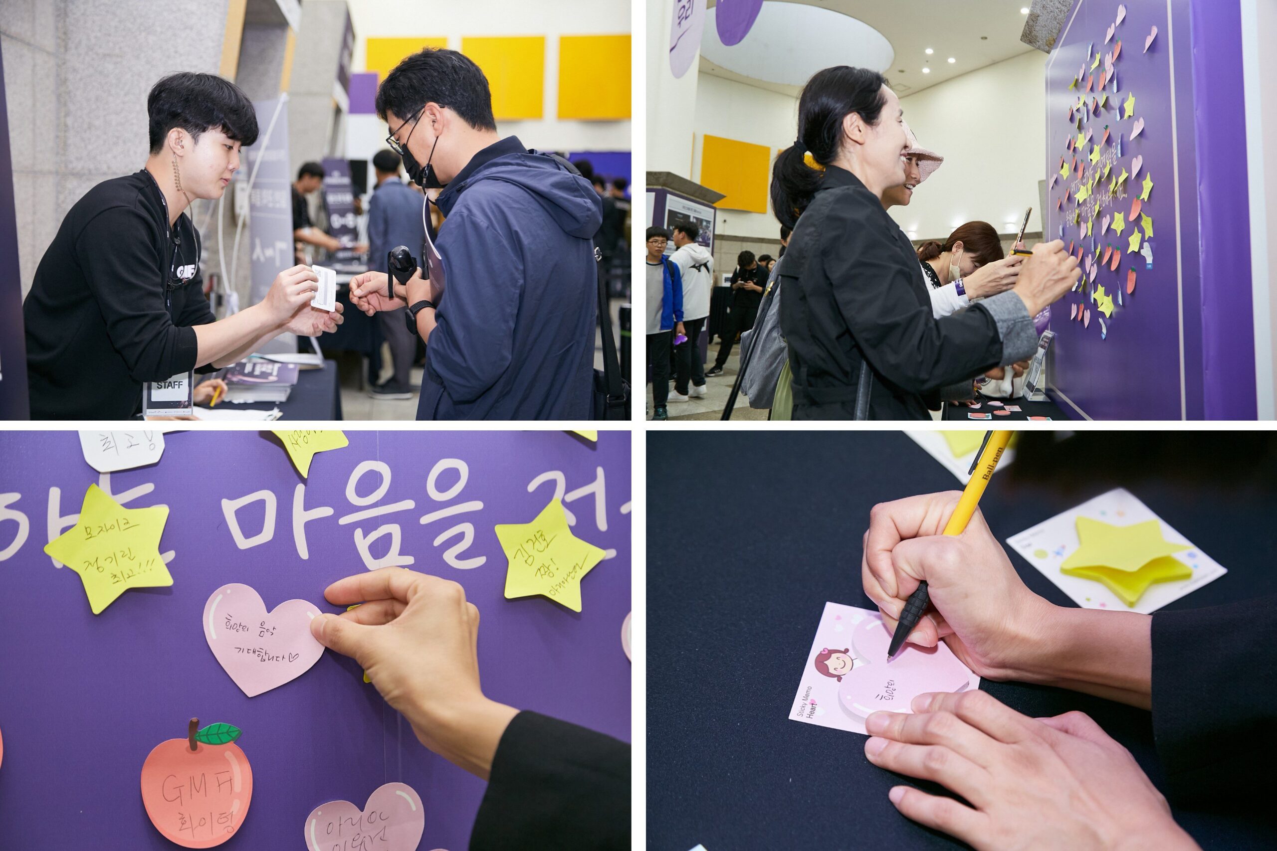 (상단 좌측) 제7회 GMF가 열린 건국대학교 새천년관 대공연장 로비에서 관객이 행사 입장권을 받고 있다. / (상단 우측) 관객이 발달장애인 연주단체를 위해 쓴 응원 메시지를 메시지 월에 붙이고 있다. / (하단 좌, 우측) 관객이 발달장애인 연주단체를 위한 응원 메시지를 포스트잇에 써서 메시지 월에 붙이고 있다.