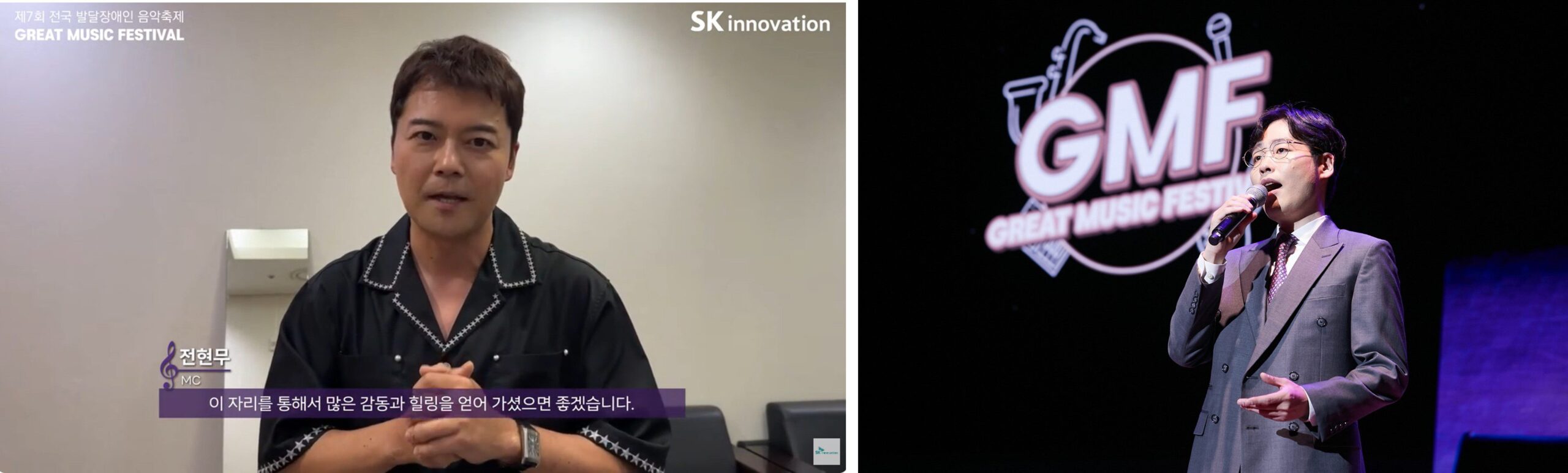 (좌) 방송인 전현무가 축하 영상을 통해 제7회 GMF를 응원하는 메시지를 전했다. / (우) 제7회 GMF에서 테너 김현수가 축하무대를 선보이고 있다.