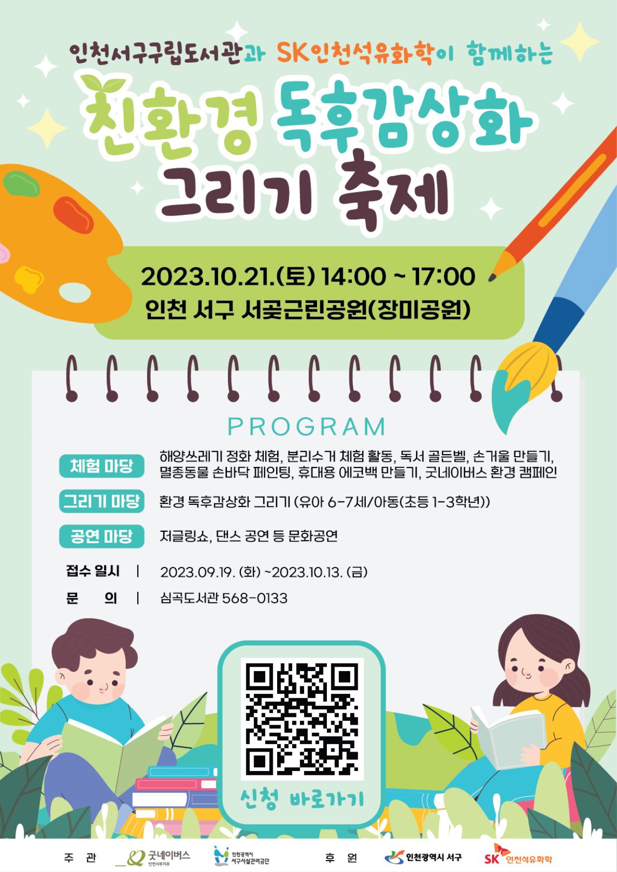 인천 서구 구립도서관과 굿네이버스가 주관하고 서구청, SK인천석유화학이 후원하는 이번 행사는 환경을 주제로 한 지정도서를 미리 읽고 느낀 점을 도화지에 그리는 대회로 유아부(6~7세)와 초등부(1~3학년)로 나뉘어 진행된다.