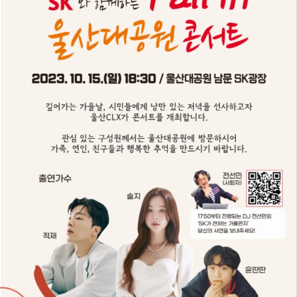 SK이노베이션 울산Complex(총괄 부사장 유재영, 이하 울산CLX)는 오는 15일(일) 저녁, 울산대공원 남문 SK광장에서 ‘SK와 함께하는 Fall in 울산대공원 콘서트’를 개최한다.