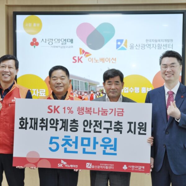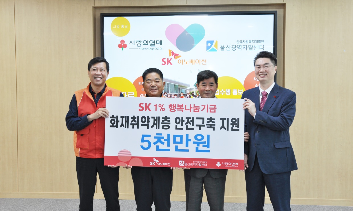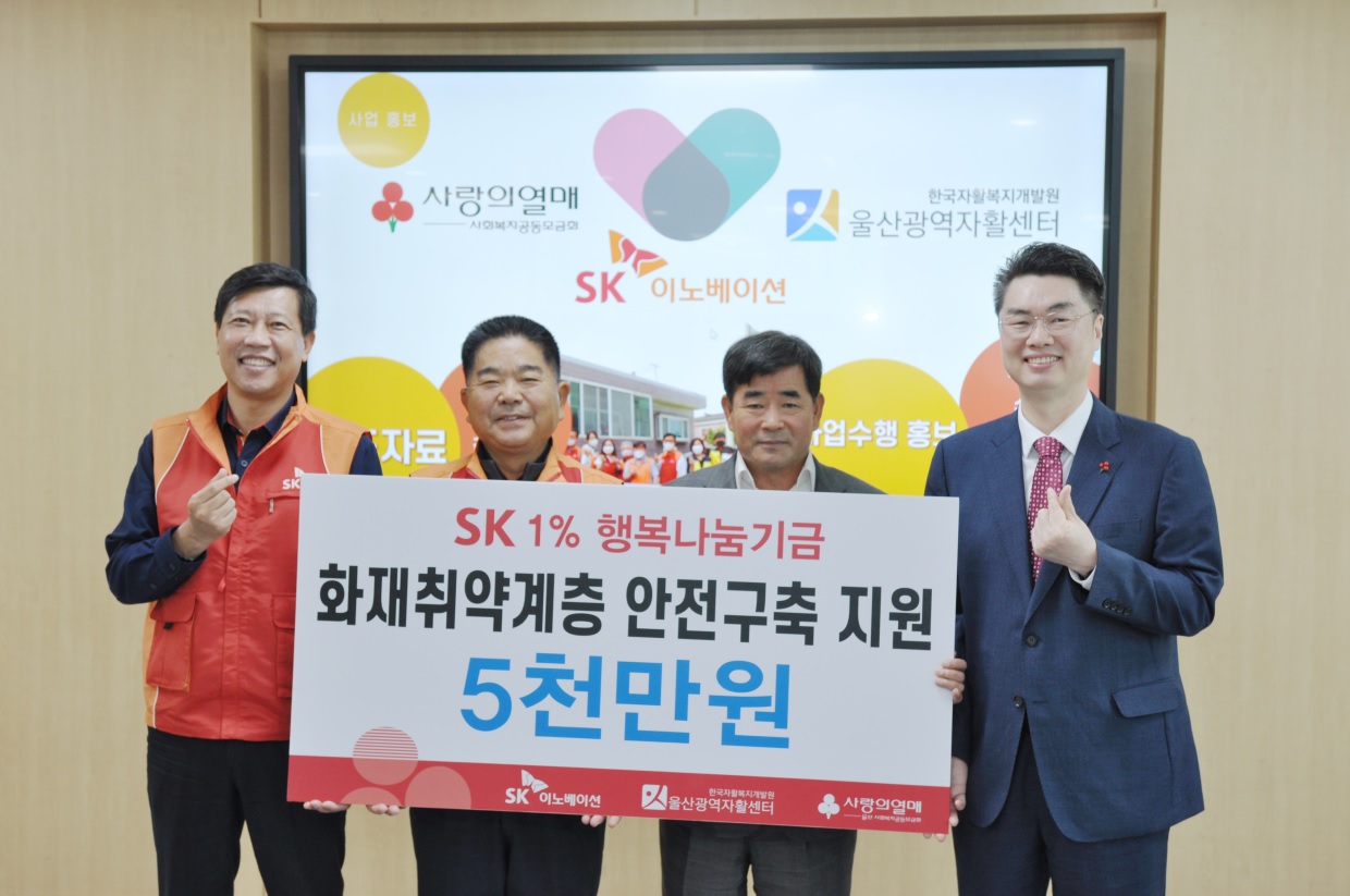 SK이노베이션 울산Complex(총괄 부사장 유재영, 이하 울산CLX)가 18일 울산 내 화재취약계층이 화재 걱정없이 안전하고 편안한 겨울철을 보낼 수 있도록 성금 5천만원을 전달했다.