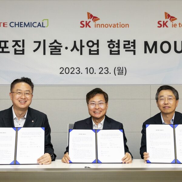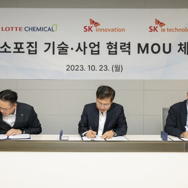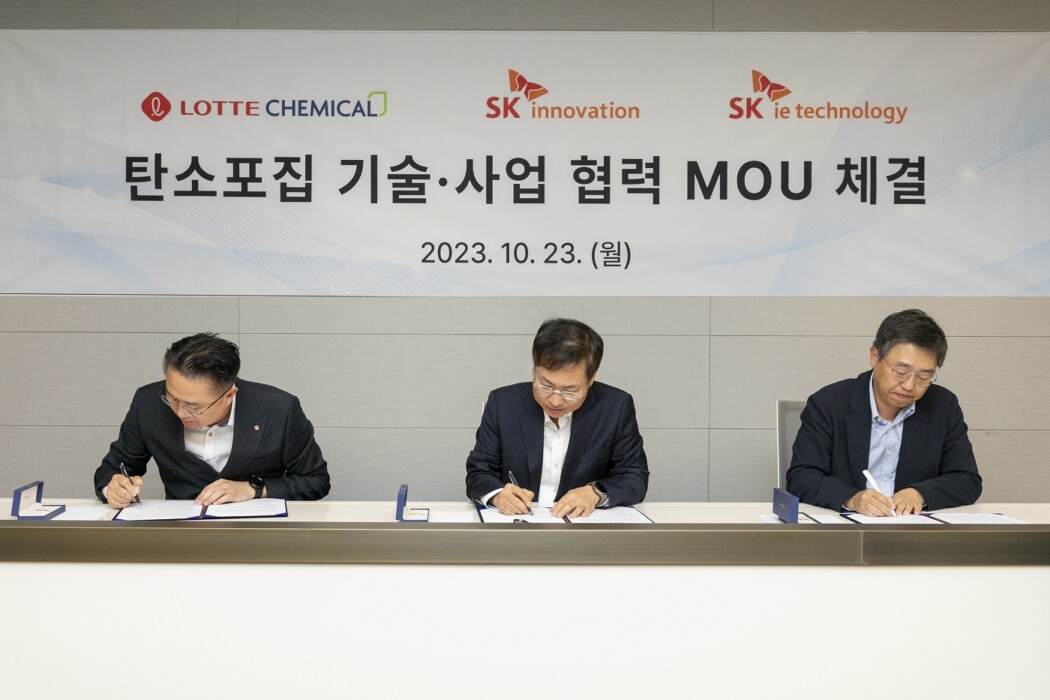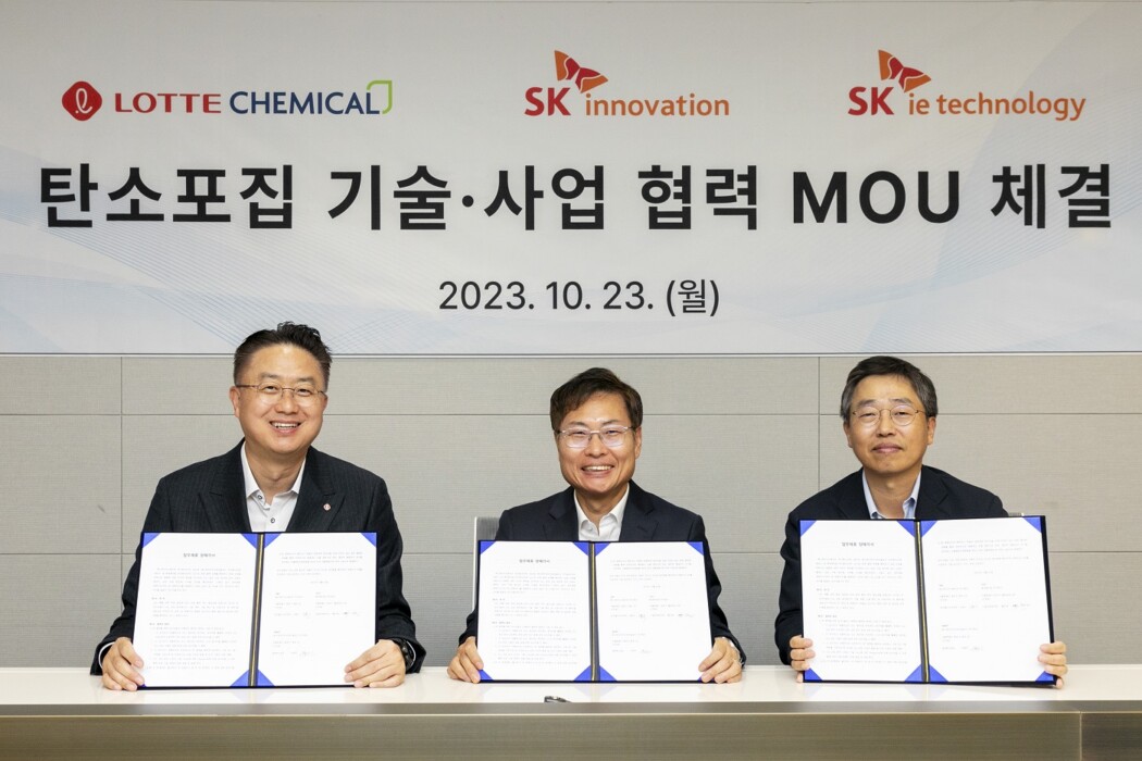 SK이노베이션, SK아이이테크놀로지가 롯데케미칼과 함께 CCUS(Carbon Capture, Utilization and Storage 탄소 포집∙활용∙저장)의 핵심인 탄소포집 분야의 경쟁력을 강화하기 위한 기술 및 사업 협력 업무협약(MOU)을 23일 체결했다.