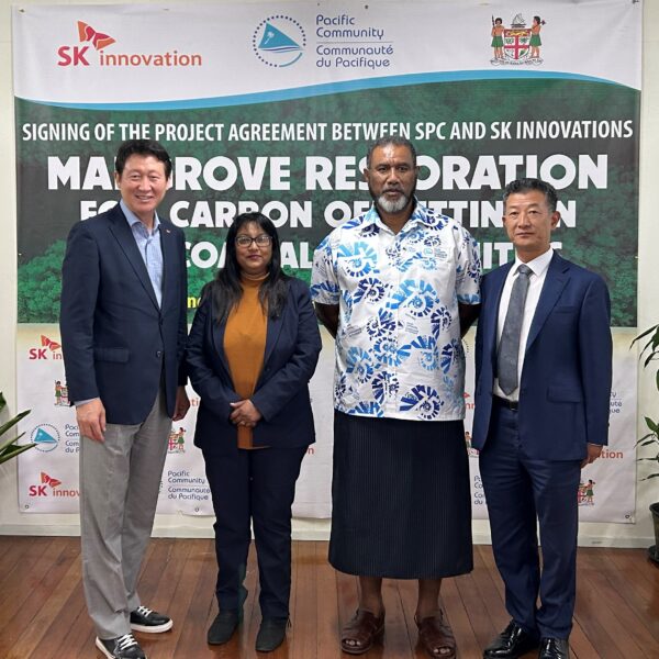 SK이노베이션은 25일(현지시각) 피지 수도 수바(Suva)에서 ‘탄소감축을 위한 피지 해안지역 맹그로브 숲 복원’ 업무협약(MOU)을 체결했다고 26일 밝혔다. 이날 협약식엔 산자나 랄(Sanjana Lal) 피지 수산임업부(Ministry of Fisheries and Forestry) 관리위원, 잘레시 마테보토(Jalesi Mateboto) 태평양공동체(Pacific Community)(*) 고문, 오중택 주피지 한국대사관 영사와 임수길 SK이노베이션 벨류크리에이션 센터장 등이 참석했다.