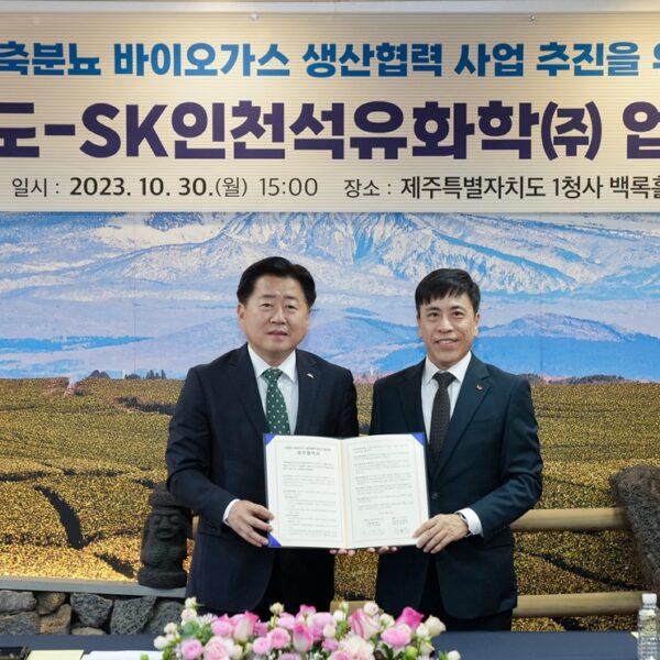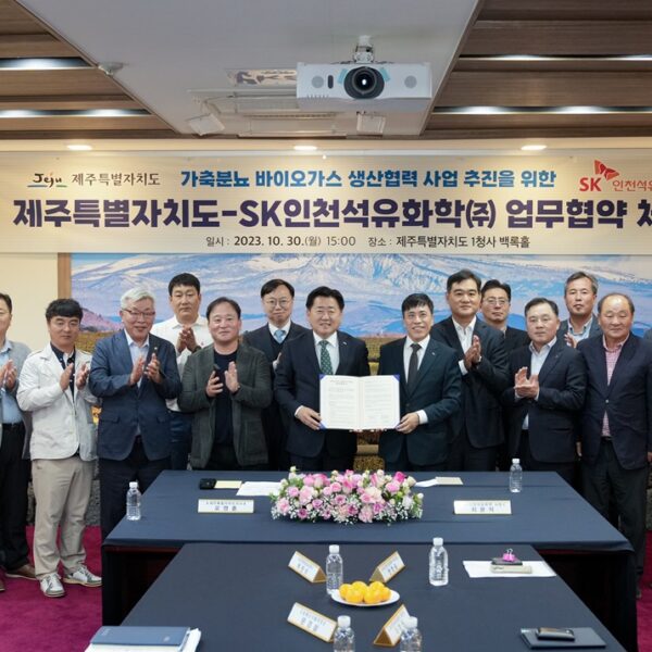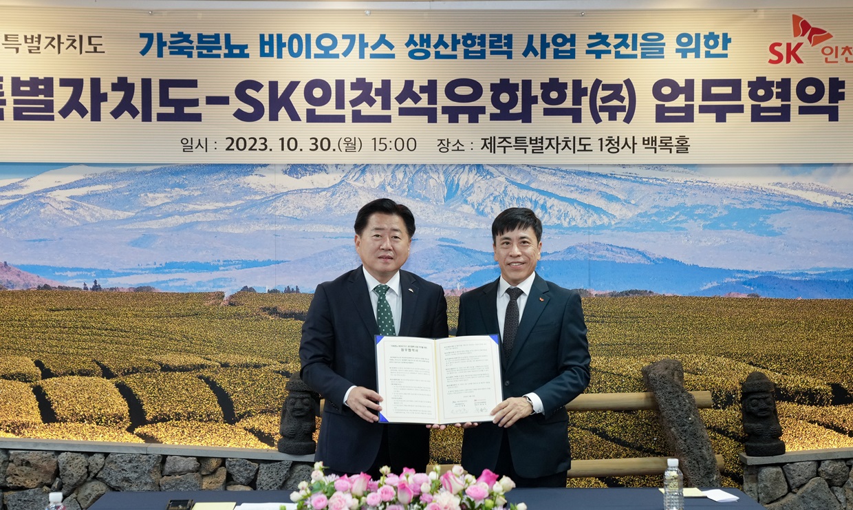SK인천석유화학과 제주도는 30일 제주도청 본관2층 백록홀에서 ‘가축분뇨 바이오가스 생산협력 사업 추진을 위한 업무협약’을 체결했다.