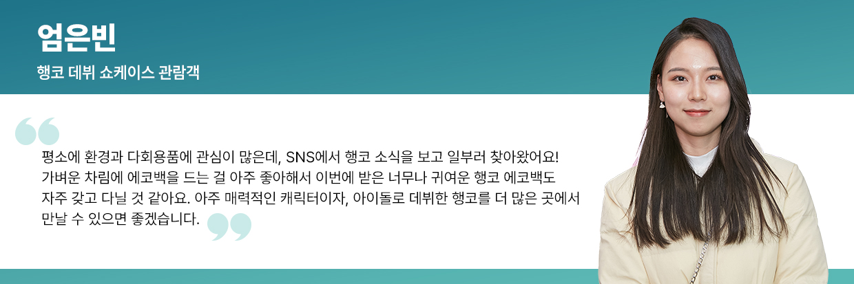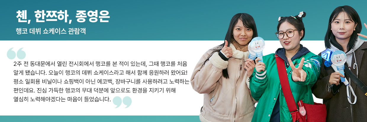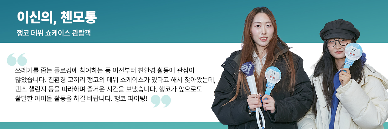 이날 행코의 데뷔 무대를 축하하기 위해 현장을 직접 찾은 관람객들은 종이 응원봉을 들고 무대 앞을 가득 메웠다. 행사장을 찾은 한 관람객은 “유튜브 영상을 통해 행코의 연습생활을 챙겨봤다. 지구 환경을 지키겠다는 기특한 마음으로 시작된 무대가 궁금해 데뷔 쇼케이스를 찾았다”며 응원의 마음을 전했다.