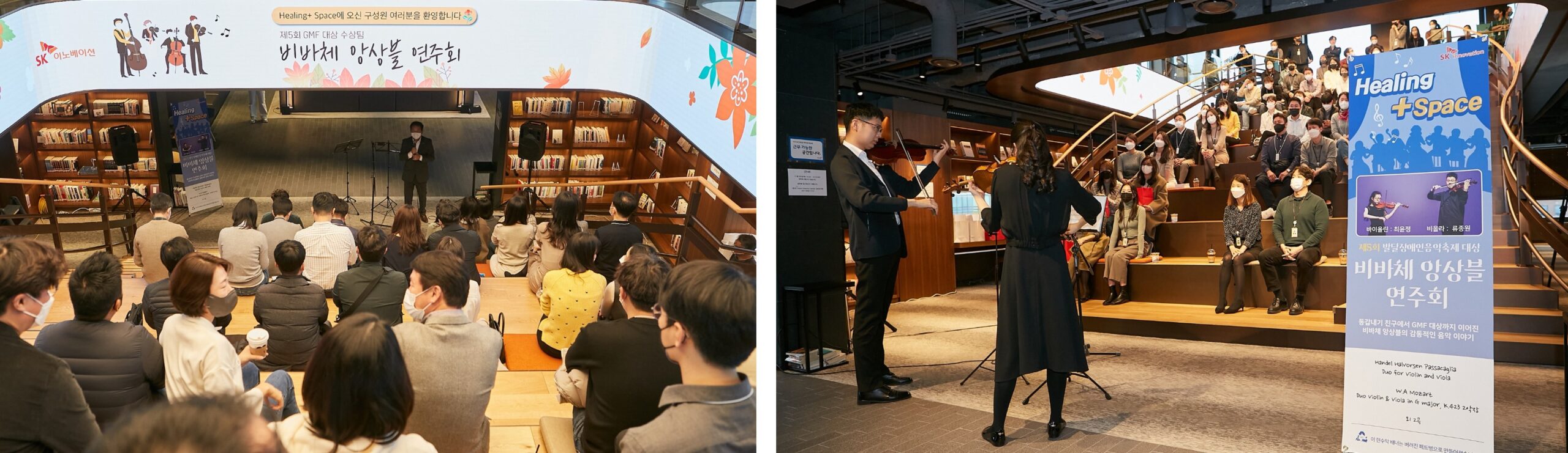 여러 공연이 모두 소중하고 참여하는 것만으로도 영광이며 즐거웠지만, 그중에서도 SK이노베이션 본사가 위치한 SK서린빌딩에서 열린 ‘힐링플러스 스페이스(Healing+Space)’ 공연이 특히 기억에 남는다. 제5회 GMF에서 수상한 후 처음으로 초대받은 연주회였기에 연주자와 보호자 모두 즐겁게 준비할 수 있었고, 현장에서 SK이노베이션 구성원들이 반갑게 맞아 주시고 크게 호응해 주셔서 많은 위안을 받았다. 그 뒤로 이어진 공연들도 모두 ‘비바체 앙상블’이 한 단계 더 성장하는 데 자양분이 되었다.