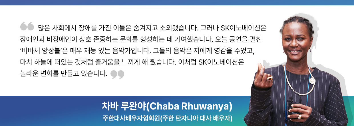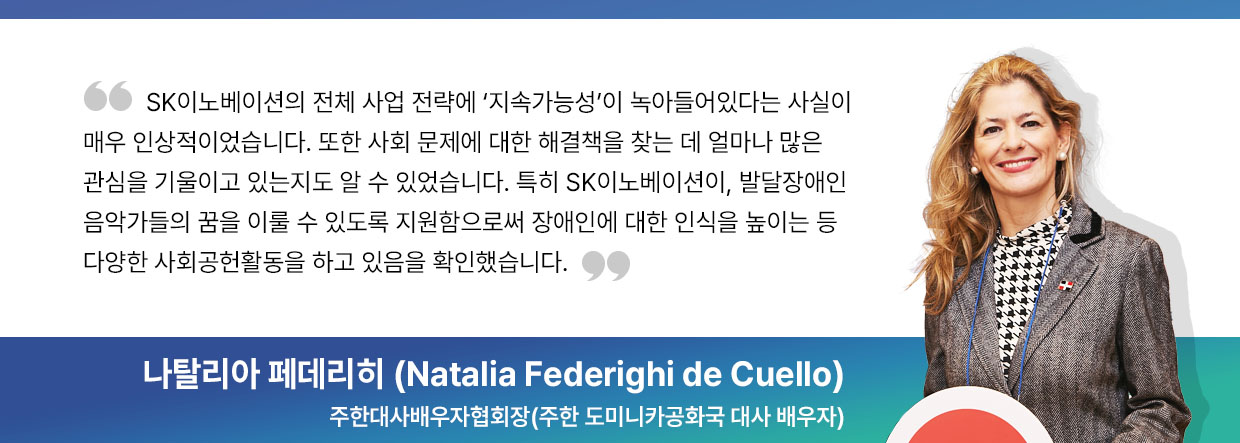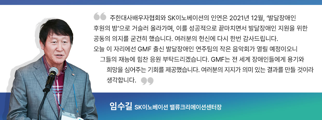 뿐만 아니라 SK이노베이션은 발달장애인 연주단체들에게 보다 많은 공연의 기회를 주고자 노력했다. 그 일환으로 지난 10월 말에는 24개국 주한외교사절 및 배우자를 초청해 ‘2023 발달장애인 후원의 밤(GMF Charity Night Gala 2023)’을 개최, 역대 GMF 수상 팀의 연주를 감상하고 그들의 밝은 미래를 함께 응원하는 자리를 마련했다.