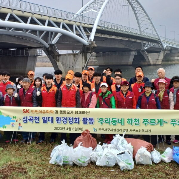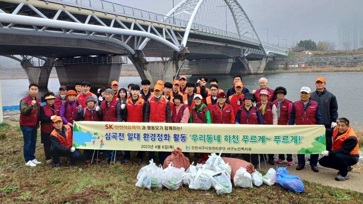 또SK인천석유화학은 인천서구노인복지관과의 협력 프로젝트로 구성된 어르신 자원봉사단 ‘행동모’(행복한 동네를 만드는 사람들의 모임)와 함께 지역사회 환경 정화 활동도 진행했다. 앞서 지난 4월 심곡천에서 EM흙공 던지기와 쓰레기 수거 활동을 했다.