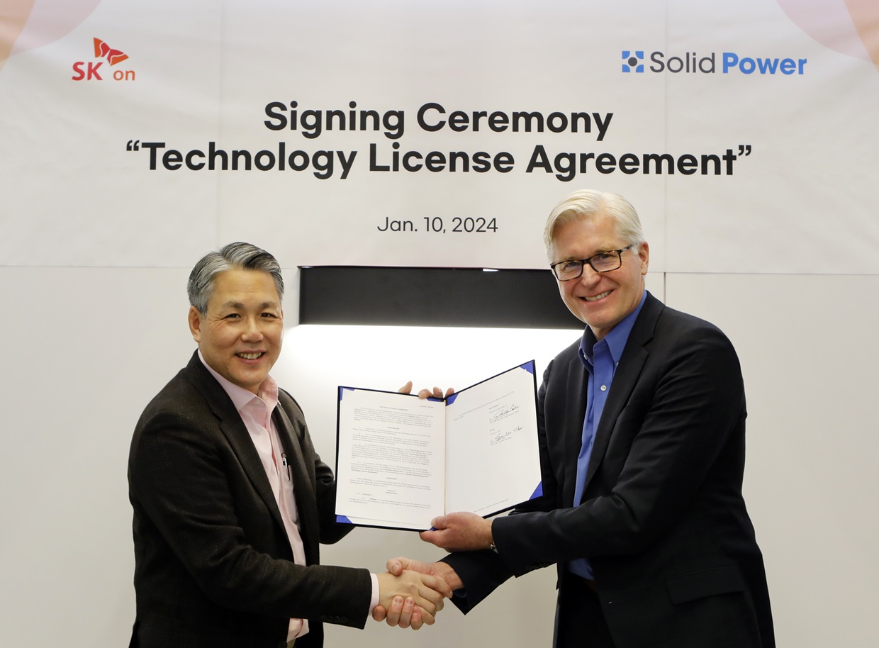 SK온은 지난 주 미국 라스베이거스에서 종료된 세계 최대 가전·정보기술(IT) 전시회 ‘CES 2024’에서 솔리드파워와 기술 이전 협약을 체결했다고 17일 밝혔다. 지난 10일(현지시간) 라스베이거스 컨벤션센터에서 열린 체결식에는 성민석 SK온 CCO(최고사업책임자)와 존 반 스코터 솔리드파워 CEO 등이 참석했다.