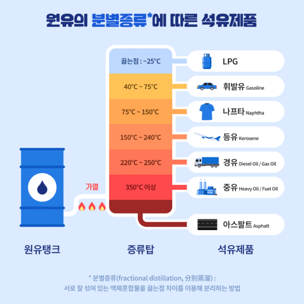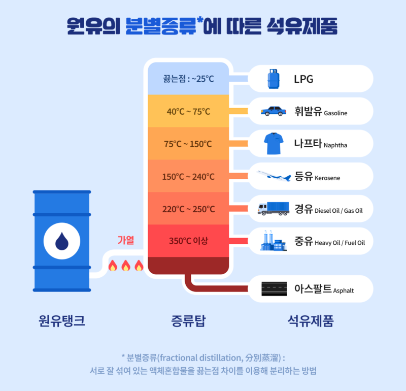 블렌딩한 각양각색의 원유를 정제하면 다양한 석유제품들이 추출된다. 의류, 플라스틱 등의 원료로 활용되는 나프타(Naphtha)는 맑고 투명한 액체다. 휘발유는 황금색에 가까운 노란색을 띤다. 끓는점을 활용한 원유 정제과정을 통해 가장 마지막으로 남게 되는 아스팔트(Asphalt)는 검은색이다.
