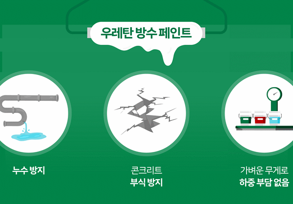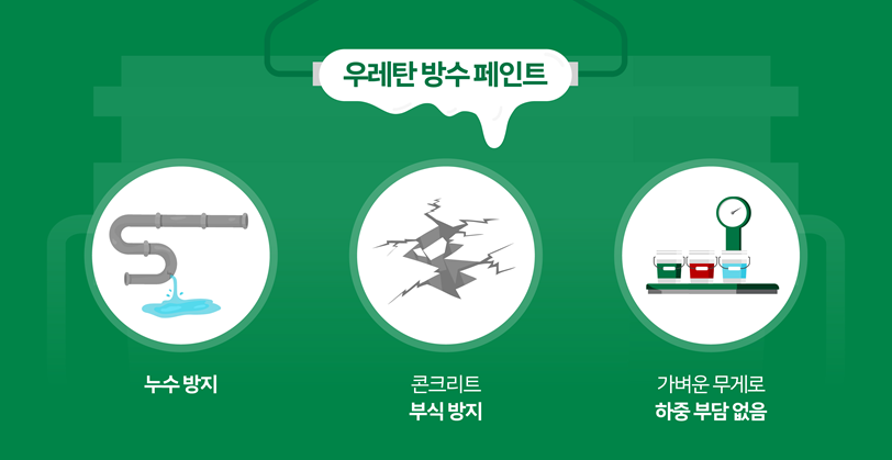 우레탄(Urethane)은 고무처럼 탄성을 가져 미세한 균열을 예방해 빗물에 의한 누수를 막아주고 내구성(耐久性), 내수성(耐水性), 내약품성(耐藥品性)을 갖춰 콘크리트 부식을 방지하는 중요한 역할을 한다. 또한, 우레탄으로 만든 방수 페인트는 무게가 가벼워 건축물의 하중에도 부담을 주지 않는다. 옥상 바닥이든 건물 외벽이든 우레탄 방수 페인트를 칠하면 일종의 ‘보호막’을 씌우는 셈이라 건물의 생명을 연장하는 데 도움을 준다.