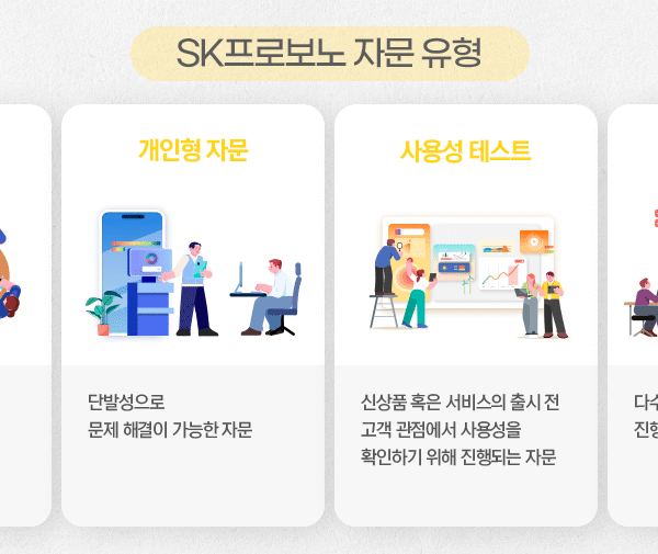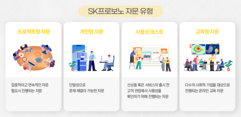 법률, 세무∙재무∙회계, 홍보 및 마케팅 전략, 인사노무, 소방·안전 등 자문 분야가 총 23개에 이를 만큼 구성원들은 다방면으로 SK프로보노 활동을 통해 기업들의 성장을 지원합니다. 이러한 SK프로보노의 자문 유형은 크게 네 가지로 나뉩니다.