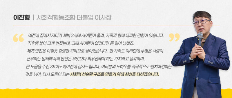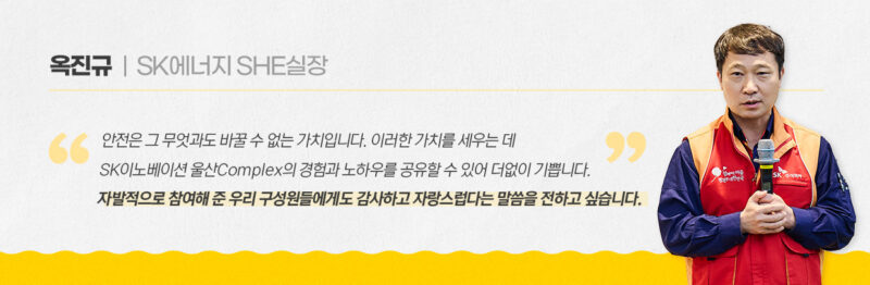 이를 기점으로 울산CLX는 총 5개의 사회적기업에 근로자 안전 교육, 공정설비 위험요인 발굴 및 제거, 산업안전보건법·위험물안전관리법 안내, 안전교육, 중대재해처벌법 관련 방지 개선 등 포괄적인 자문 서비스를 제공해 기업의 성장을 지원할 계획입니다. 대전에 위치한 SK이노베이션 환경과학기술원도 소방·안전 자문그룹을 비롯한 플라스틱 재활용 자문 그룹을 출범해 올해 4분기부터 사회적기업을 지원하는 본격적인 활동을 펼쳐나갈 예정입니다.