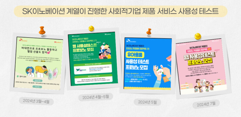 한편, SK이노베이션 계열은 올해 상반기 총 3기에 걸쳐 사용성 테스트에 참여할 구성원 프로보노를 모집했어요. 사회적기업의 상품 사용성 테스트, 앱/웹 사용성 테스트 참여자 모집공고를 인트라넷에 올릴 때마다 구성원들의 열띤 참여에 빠르게 마감됐죠. 기수당 약 100명, 지금까지 총 300여 명의 구성원들이 사회적기업의 제품 및 서비스를 꼼꼼히 사용해 보고 정성 어린 개선 의견을 보내 주었어요.