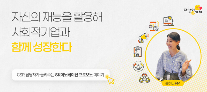 특히, 올해 SK이노베이션 계열은 SK프로보노 사무국과 협력해 보다 본격적으로 체계화된 프로보노 봉사활동을 전개할 계획이다. 업무 역량을 활용한 사회문제 해결에 일조하기 위해, 프로보노 활동에 나선 구성원들을 적극 지원하고 있는 SK이노베이션 CSR담당 홍하나 PM과 이야기를 나눴다.