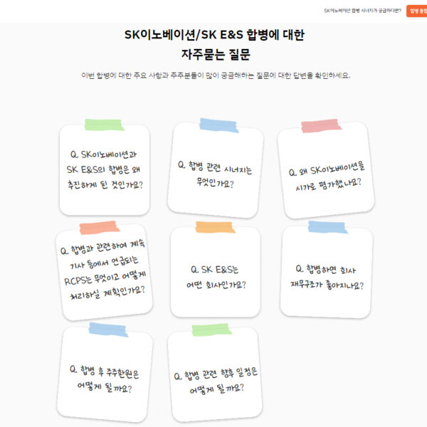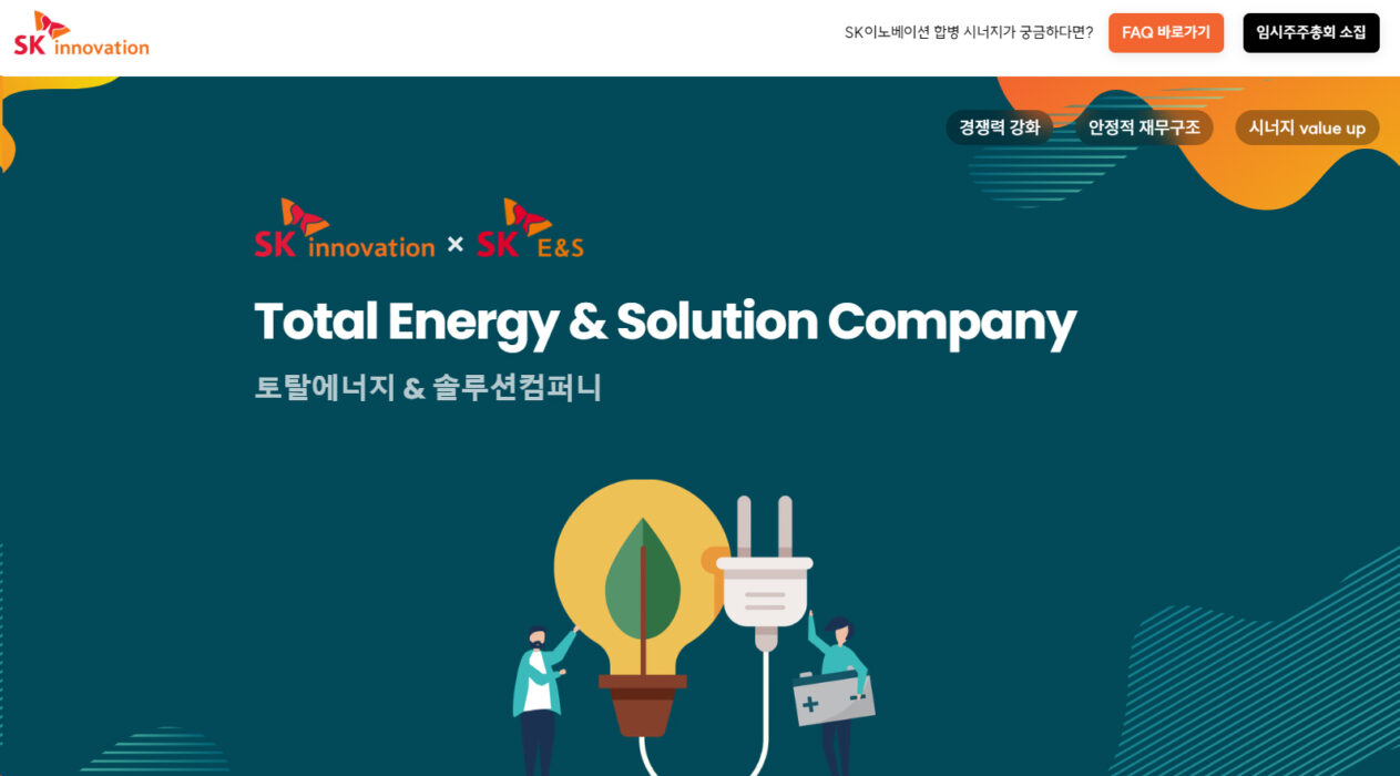 SK이노베이션은 지난 5일부터 자사 인터넷 홈페이지와 포털 네이버 등에 ‘SK이노베이션–SK E&S 합병’ 사이트를 별도로 개설해 △합병 통합 시너지 △일반 주주 주요질문 및 답변 △임시 주주총회 소집 등 각종 정보를 제공하고 있다고 22일 밝혔다.