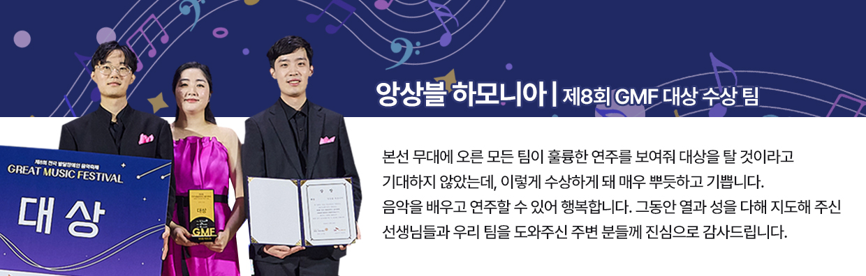 제8회 GMF 대상 수상의 영예는 멘델스존의 피아노 3중주 1번 1악장을 연주한 앙상블 하모니아에게 돌아갔다. 최우수상은 보석공장친구들(JFF), 우수상은 비전 피아노 앙상블과 아리아 난타가 각각 수상했다. 장려상에는 아피니떼 앙상블과 울산리플예술단이 이름을 올렸다.