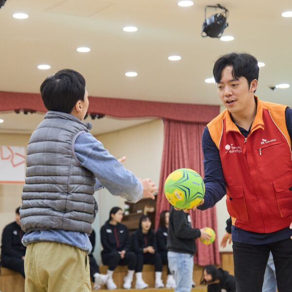SK엔무브가 발달장애 아동이 사회에 잘 적응하고, 풍부한 감성을 갖도록 하기 위해 핸드볼 교실을 운영하고 있다.
