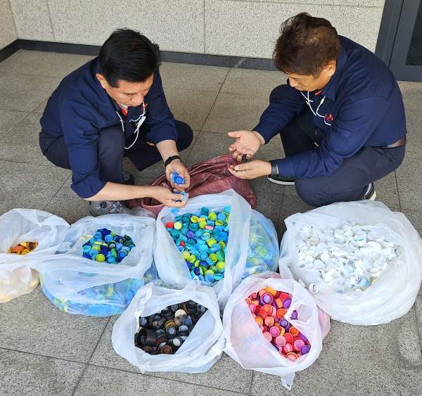 (사진2) SK인천석유화학 구성원들이 수집한 병뚜껑을 분류하는 모습