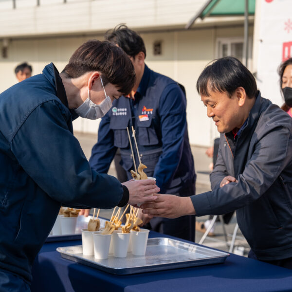 (사진2) 김종화 SK에너지 사장이 ‘2025 SK이노베이션 협력사 상생기금 전달식’ 현장에 마련된 어묵 푸드트럭에서 협력사 구성원들에게 어묵꼬치를 나눠주는 모습