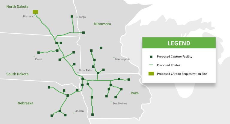 SK E&S가 참여하는 써밋(Summit) 프로젝트는 ‘옥수수 벨트’라고 불리는 미국 중서부 지역에서 진행됩니다. 아이오와, 미네소타, 노스다코타, 사우스다코타, 네브라스카 등 5개 주에 위치한 바이오 에탄올 생산 공장에서 발생하는 이산화탄소(이하 CO₂)를 포집하고, 전용 파이프라인을 통해 노스다코타(North Dakota)주에 운송, 탄소저장 설비에 영구 지중 저장하는 것입니다.
