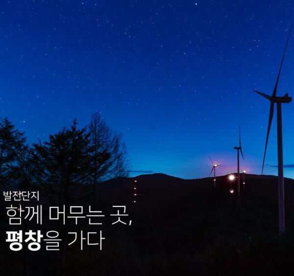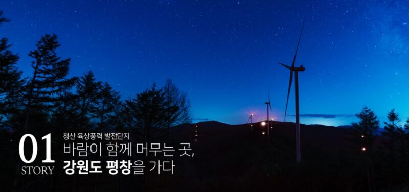 월정사 전나무숲이 지닌 아름다운 자연 풍경과 이를 생생히 담아낸 문학 소설 ‘메밀꽃 필 무렵’이 살아 숨 쉬는 곳, 평창. 평창은 천천히 사색하고 여유 있게 숨을 고를 수 있는 곳이었다. 또한 사시사철 한결같이 부는 바람이 인간과 공생하는 장소이기도 했다. 청정한 바람이 청산 육상풍력 발전단지에 세차게 분다. 이곳을 여행하면 그동안 잊고 있었던 자연의 소중함과 환경의 의미를 되새길 수 있다. 평창이 간직한 자연 그대로의 모습이 지속가능한 깨끗한 풍력 에너지가 되어 우리에게 온다.