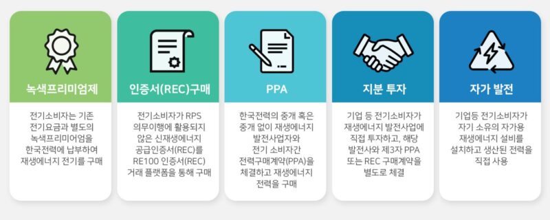 K-RE100의 이행수단에는 녹색프리미엄, REC 구매, PPA, 지분 참여, 자가 발전 등 5가지가 존재합니다. 이번에 SK E&S와 아모레가 시행한 PPA 역시 K-RE100 이행수단 중 하나입니다.