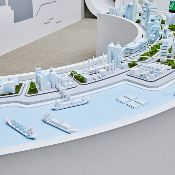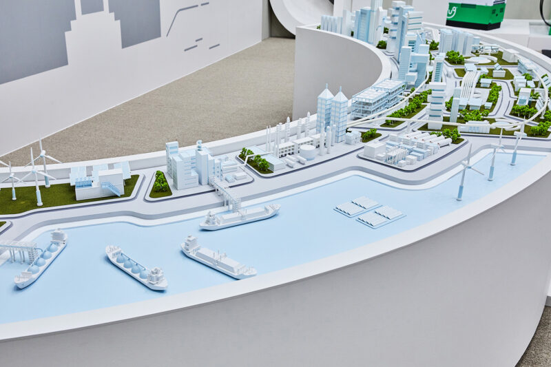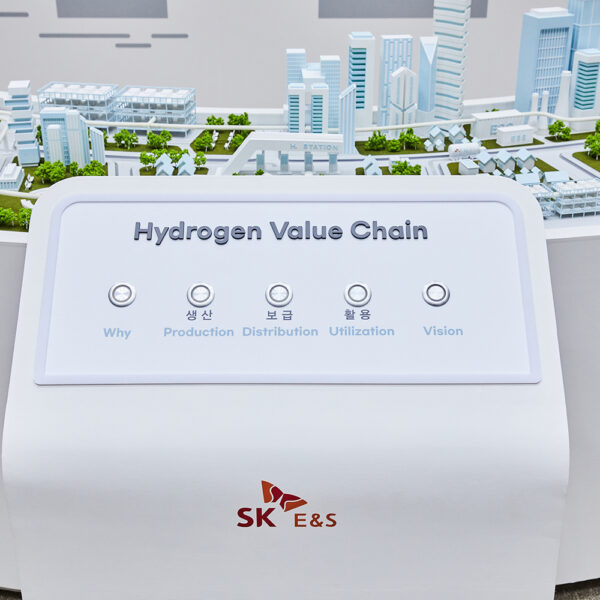 디오라마에는 SK E&S가 추진하고 있는 수소 생태계가 한눈에 담겨 있습니다. 앞쪽에 있는 버튼을 누르면 수소 생산, 유통, 소비 등 각 단계가 진행되는 과정을 살펴볼 수 있습니다.