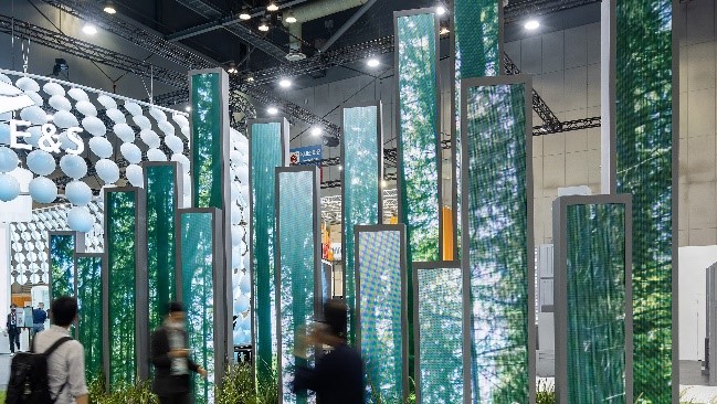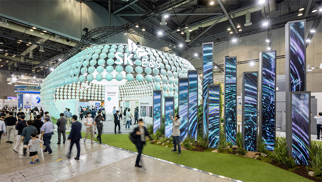 SK E&S 전시관 외관은 에너지 셀(Energy Cell)을 형상화한 독특한 형태로 친환경 에너지들의 유기적 연결을 표현했습니다. 부스 외관을 덮은 약 1,000여 개의 반구는 재생 플라스틱을 활용해 제작된 것으로 SK E&S가 그려 나가는 친환경 에너지 생태계에 대한 의지를 담았습니다.