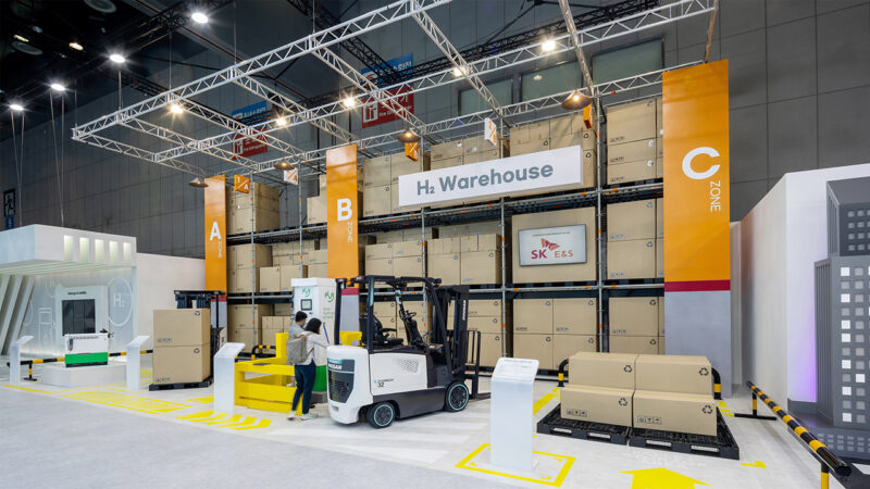 H₂ Warehouse Zone에는 친환경 수소물류센터의 모습을 그대로 재현해 수소 지게차 및 플러그파워(Plug)의 수소연료전지, 수소충전기 등을 전시했습니다.