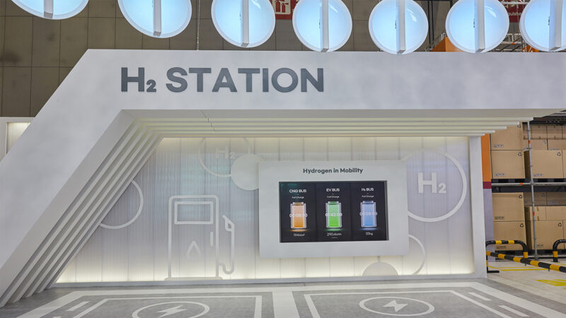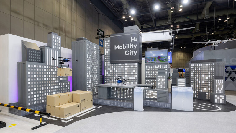 H₂ Station은 빠른 충전시간과 높은 안정성을 강점으로 하는 수소 충전소를 공간 연출하며, H₂ Mobility City에서는 수소 드론을 활용한 도시 항공 배송 모습을 구현했습니다.
