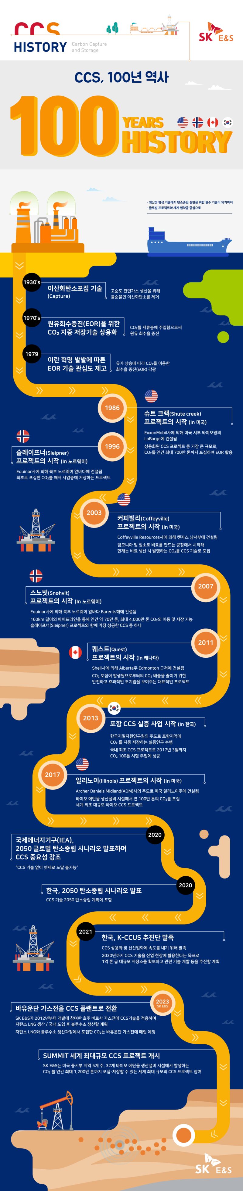 3편은 생산성 향산 기술이 탄소중립 실현을 위한 필수 기술이 되기까지의 CCS 100년 역사에 대한 인포그래픽입니다.