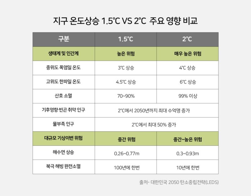 파리기후변화협정에 따르면 “지구 평균 온도 상승을 1.5°C 이내로 제한할 수 있으면 2°C 상승보다 물 부족 인구가 최대 50% 감소할 것이며 기후 영향 따른 빈곤 취약 인구도 최대 수억 명 줄어들 것”이라고 합니다.