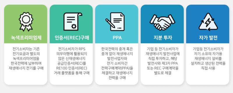 (**) 재생에너지 공급인증서로 전력 소비자가 전력 생산자로부터 인증서를 구매하고, 구매량만큼의 재생 에너지 사용을 인정받는 제도