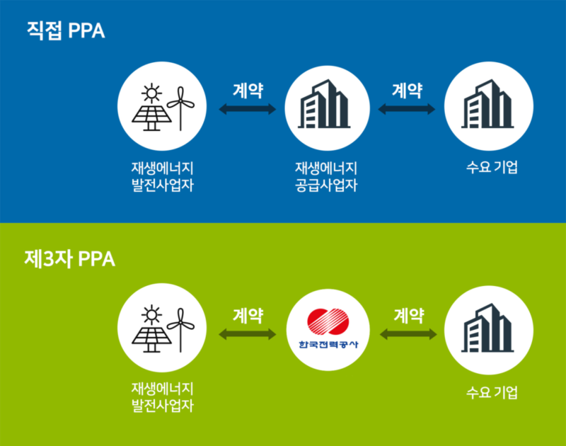 PPA는 민간 발전사와 전력 사용자 간의 전력 수급 계약을 의미합니다. 우리나라는 풍력, 태양광 등 재생에너지에 한해서 PPA를 허용하고 있으며, 이는 또 직접 PPA와 제3자 PPA로 나눌 수 있습니다. 직접 PPA는 재생에너지 생산자와 사용자가 직접 전력을 거래하는 방식이고, 제3자 PPA는 생산자와 사용자 사이에 한국전력공사가 중개자(제3자) 역할을 하는 방식입니다.
