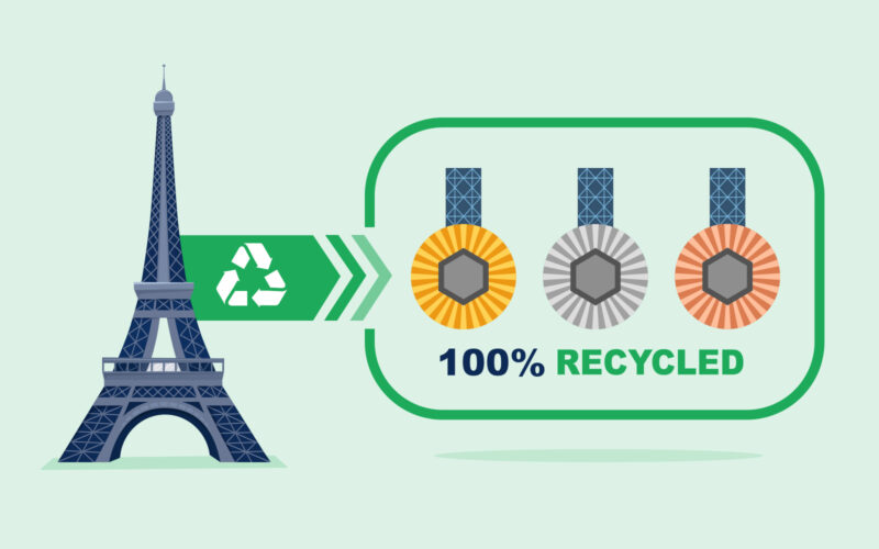 또한 금메달과 은메달은 100% 재활용된 소재로 제작했습니다. 메달 뒷면에는 프랑스를 상징하는 육각형 모양의 철조각이 담겨있으며, 이 철조각은 에펠탑 개보수 과정에서 철거해 보관했던 것을 재활용한 것입니다. 더불어 일회용품의 사용은 최소한으로 줄였습니다. 관중은 일회용 페트병에 담긴 음료를 사먹는 대신 재사용이 가능한 컵을 이용해 경기장 곳곳에 설치된 700개의 음료 및 식수대에서 원하는 만큼 음료를 가져갈 수 있었습니다.