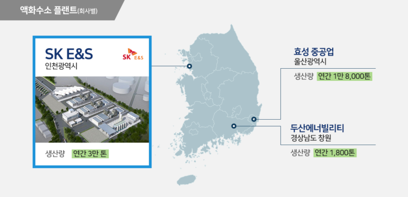 이중 SK E&S의 액화수소 플랜트는 세계 최대 규모를 자랑하고 있습니다. 인천 서구 원창동에 위치한 인천 액화수소 플랜트는 연간 최대 3만 톤의 액화수소 생산이 가능합니다. 이는 수소 버스 약 5천 대를 충전할 수 있는 수준입니다. 또한, 인천 액화수소 플랜트는 국내에서 유일하게 수도권에 위치한 액화수소 생산 공장으로 상업 가동 시, 주 수요처인 수도권에 경제적인 운송이 가능할 것으로 기대됩니다.