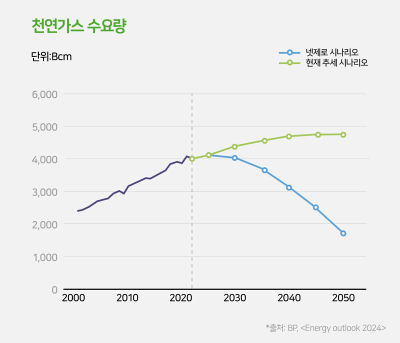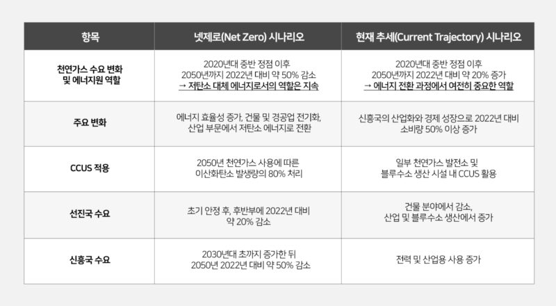 그러나 ‘현재 추세(Current Trajectory) 시나리오’에 따르면 천연가스 수요가 “2050년까지 2022년 기준 약 20% 증가”할 것으로 보입니다. 선진국에서는 “에너지 효율 개선과 전기화로 천연가스 수요가 점진적으로 감소될 것으로 예상”되는 반면, 신흥국에서는 “산업화와 경제 성장에 따라 천연가스 수요가 크게 증가”하여 전체 천연가스 수요는 2050년까지 지속적으로 증가할 것으로 예상되었습니다.