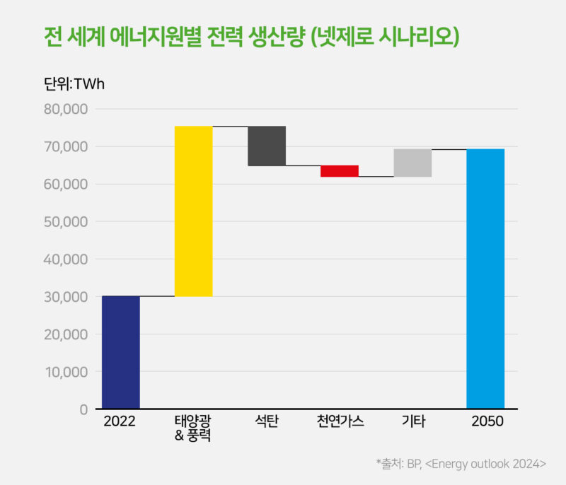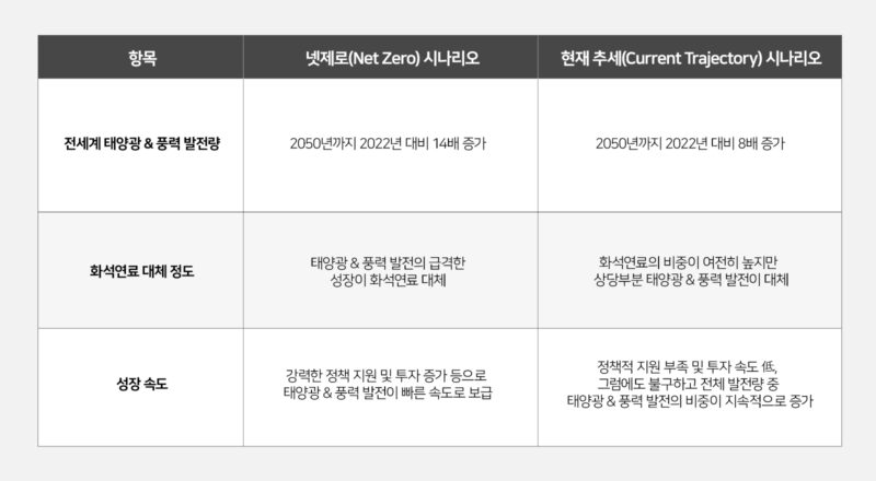 ‘넷제로(Net Zero) 시나리오’에 의하면 “2050년까지 태양광 & 풍력 발전으로 생산하는 전력의 양이 2022년 대비 14배 증가”하고 “태양광 & 풍력 발전에 대한 강력한 정책적 지원 및 투자 증가”가 예상됩니다. 이에 따라 태양광 & 풍력 발전은 “화석연료를 대체하며 탈탄소화를 이끄는 핵심 역할을 할 것”으로 보입니다.