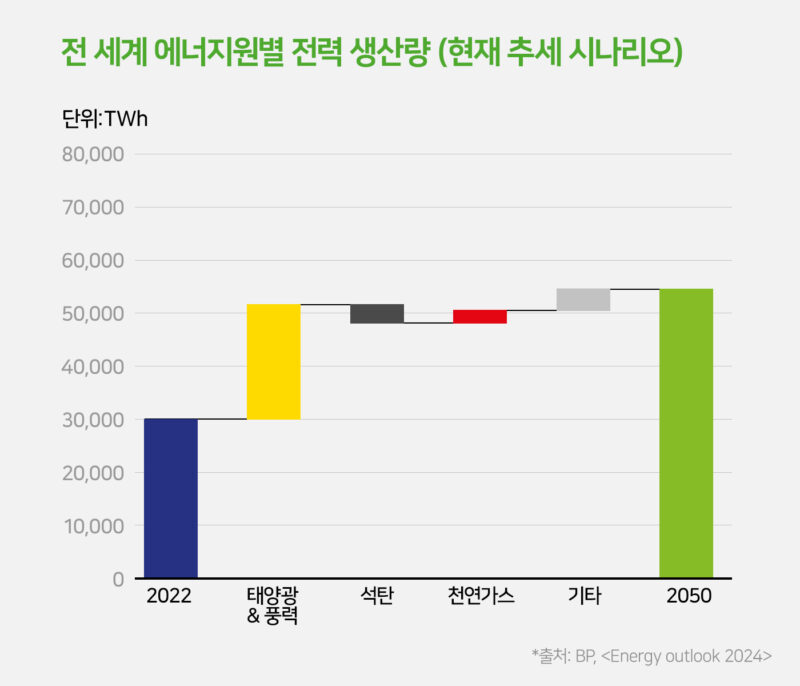 ‘현재 추세(Current Trajectory) 시나리오’에서도 “2050년까지 태양광 & 풍력 발전으로 생산하는 전력의 양이 2022년 대비 8배 이상 증가”할 것으로 예상됩니다. 해당 시나리오에서 석탄 발전의 비중은 2022년 대비 40% 줄어드는 반면, 천연가스 발전은 2022년 대비 40% 이상 증가할 것으로 예상됩니다.