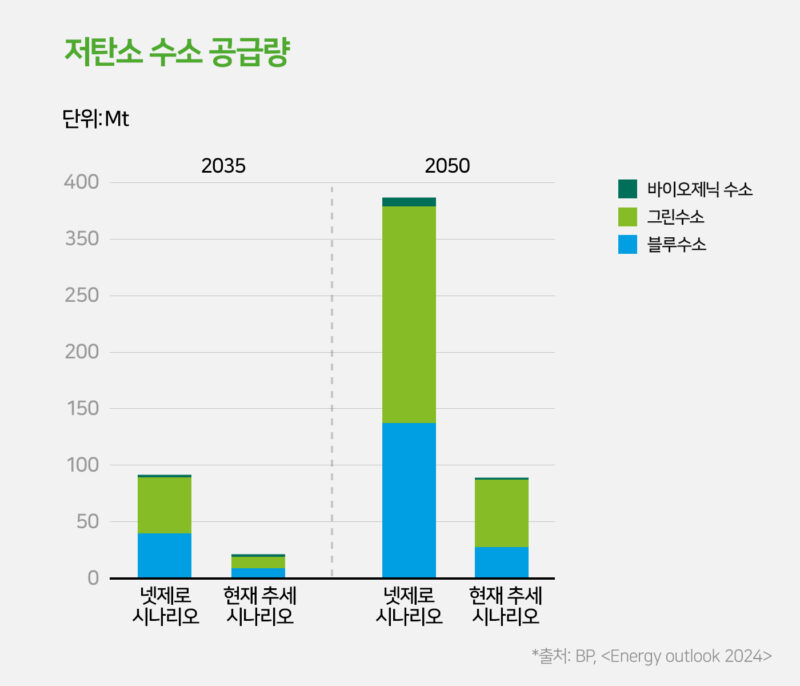 ‘현재 추세(Current Trajectory) 시나리오’에서도 수소 수요가 “점진적으로 증가”하며 “블루수소가 저탄소 수소 시장의 중심”이 될 가능성이 높습니다. “고비용으로 인해 그린수소에 대한 수요 증가속도는 더딜 것”으로 예측되지만, 풍력 & 태양광 발전의 대량 보급으로 인해 여분의 전력을 보관하기 위한 그린수소의 생산량은 증가할 것으로 예상됩니다.